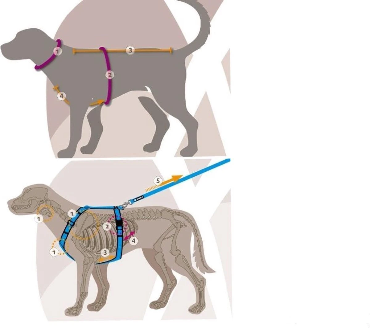 Het harnas is ontworpen om zich ergonomisch aan het lichaam van de hond aan te passen, waardoor een optimale trekverdeling wordt gecreëerd, die de rug van uw hond beschermt. Voorwaarde hiervoor is dat de riem alleen aan de aangewezen achterste ring is gehaakt.