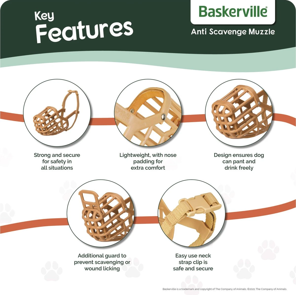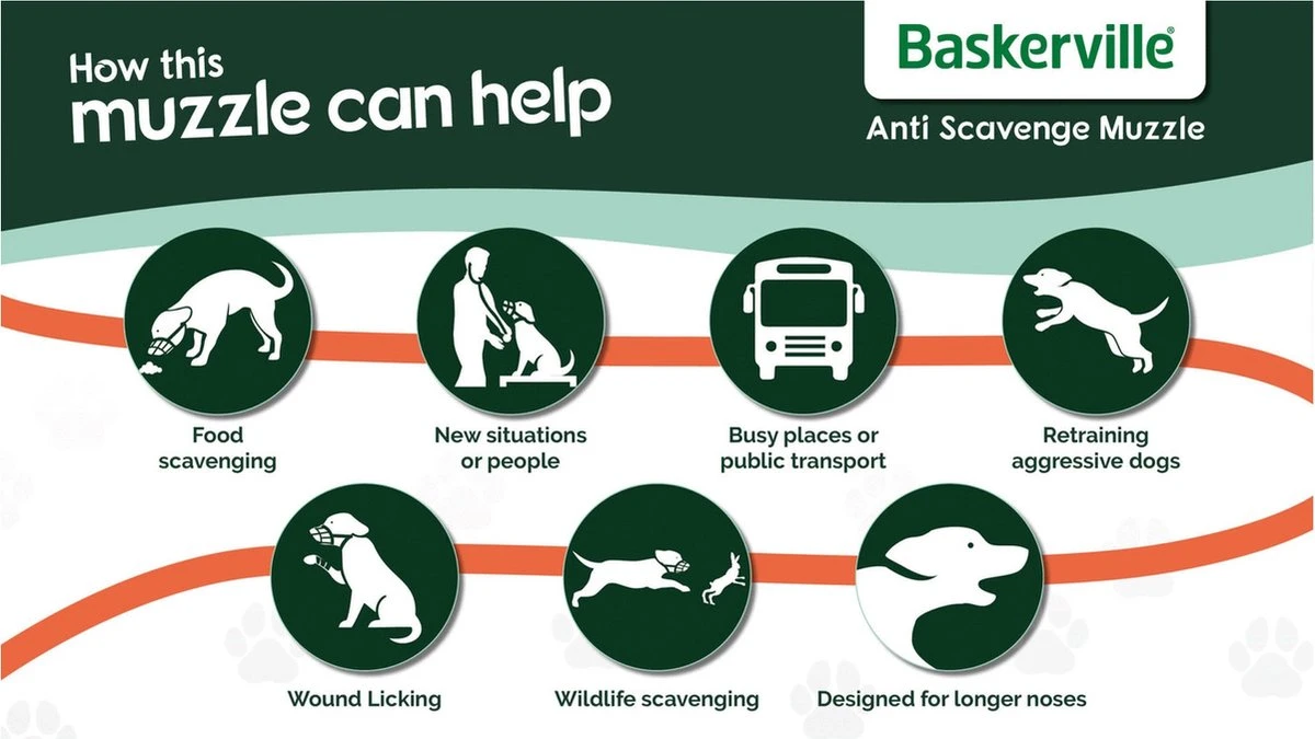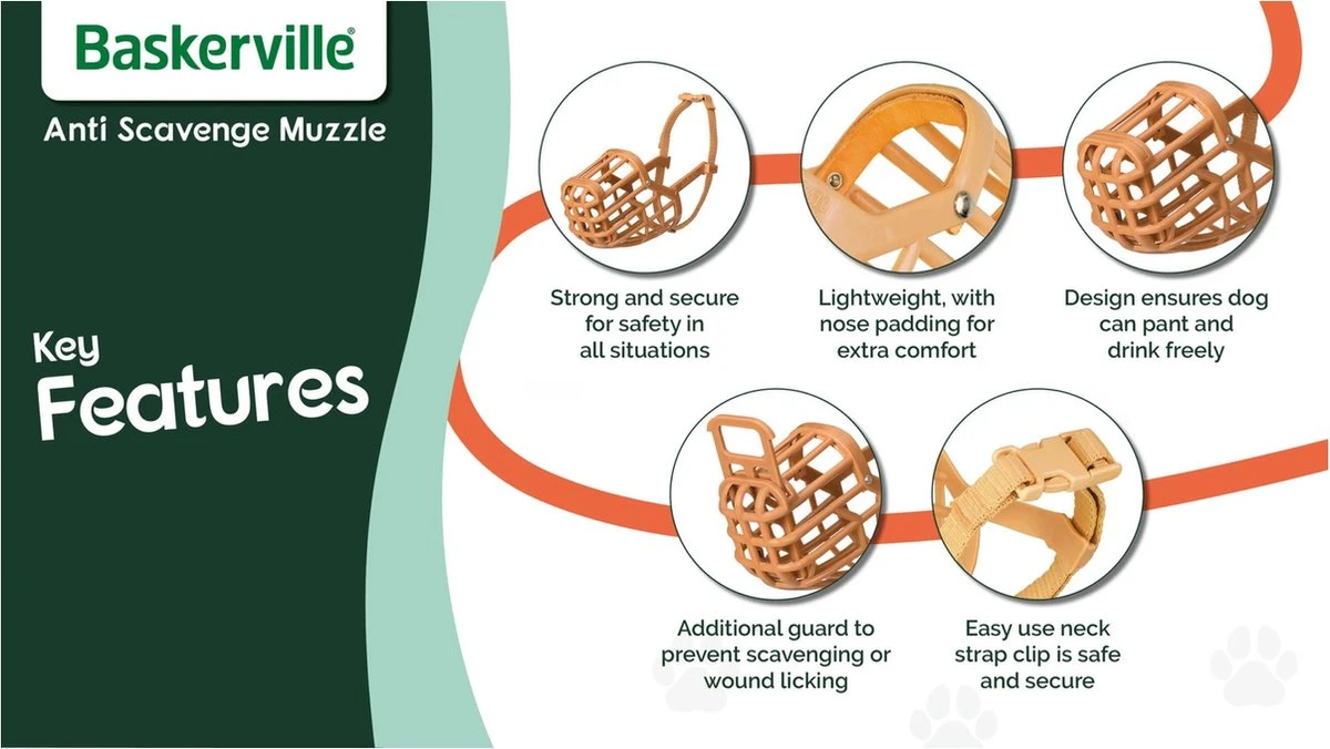 Deze muilkorf van Baskerville is ontworpen voor maximale veiligheid en comfort voor de hond. Het materiaal is buitengewoon sterk en duurzaam, en toch buigzaam en zacht. De veiligheidsband zorgt er voor dat de muilkorf op zijn plaats blijft. Door de muilkorf wordt overmatig likken en eten voorkomen, tevens kan de muilkorf tijdens dierenartsbezoeken worden gebruikt.