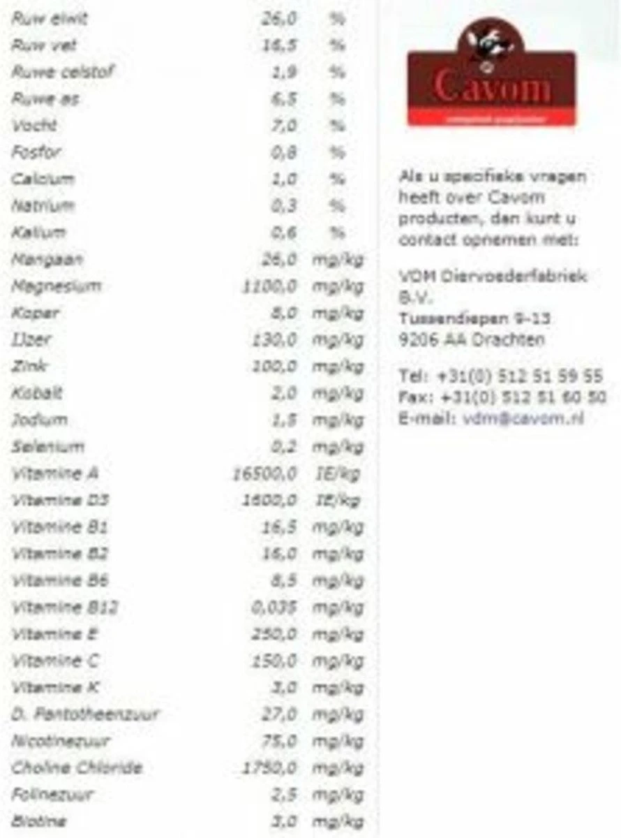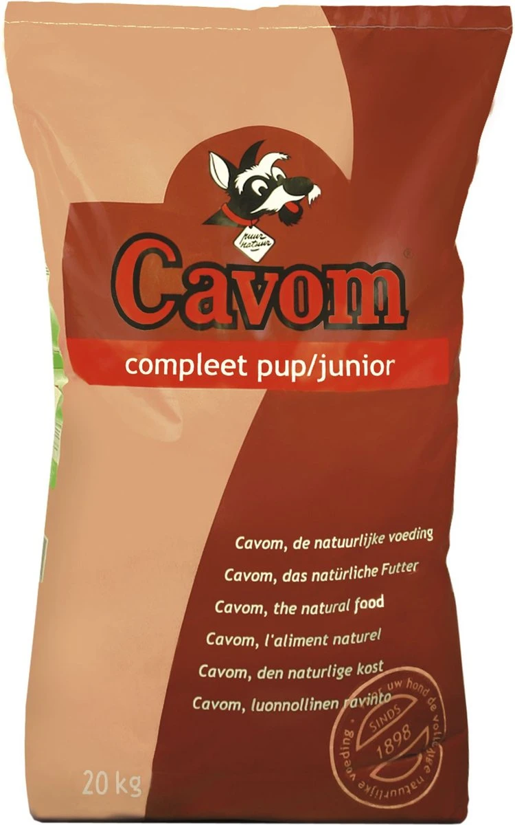 Deze volledige hondenbrokken van Cavom zijn ontwikkeld voor pups van 4 á 5 weken tot ongeveer 6 á 7 maanden. Bij dit voer zijn granen zoals maïs, tarwe en rijst bijna geheel weggelaten, waardoor de kans op een overgevoeligheidsreactie minimaal is. Doordat plantaardig eiwit, olie, rundvet en schaap- en rundvlees is toegevoegd heeft dit voer een hoge calorische waarde, wat een gezonde groei stimuleert. Hiernaast bevat Cavom Compleet Pup/Junior alle nodige voedingsstoffen voor een pup in de groei.