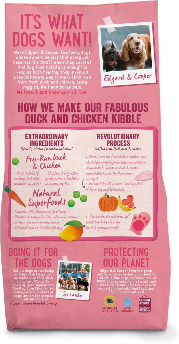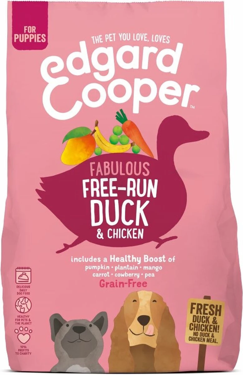 Dit recept is gemaakt voor kleine wildebrassen die barsten van energie. De onweerstaanbare mix van verse kip en eend is om poten, kom en baasje van af te likken: geen restjes dus! Natuurlijk doet Edgard & Cooper je pup ook echt goed. Eenden- en kippenvlees helpt bij de spieropbouw en versterkt het immuunsysteem. Omdat deze brokjes geen granen bevatten zijn ze ook helemaal oké voor pups met gevoelige maagjes.