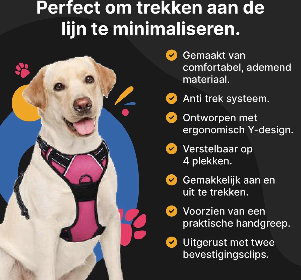 Heb jij een hond die flink trekt? Dan is het belangrijk dat je de juiste uitrusting gebruikt om blessures te voorkomen. Zeker bij grotere honden krijg je vaak last van je arm, schouders of nek na een wandeling. Maar ook de hond zelf kan klachten krijgen. Maak je de lijn bijvoorbeeld vast aan de halsband? Dan brengt het trekken al snel schade toe aan de nek en luchtwegen. Bovendien wordt het trekgedrag soms juist extra gestimuleerd, doordat er spanning op de halsband komt te staan.