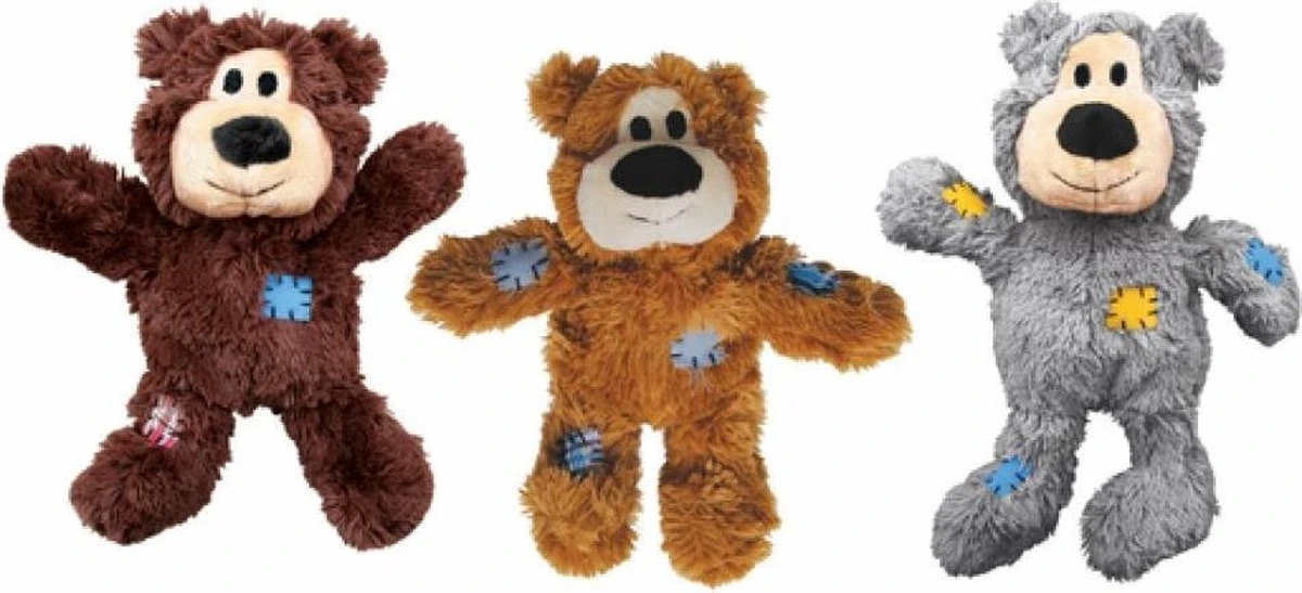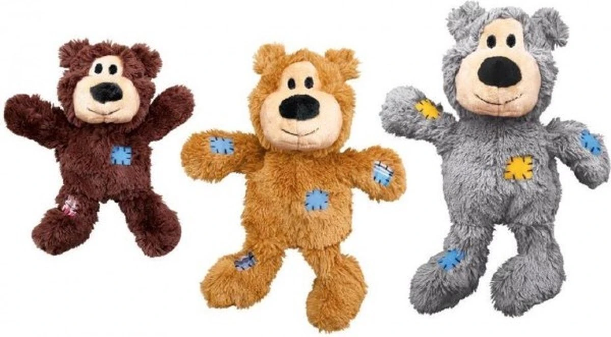 Kong Wild Knots BearsKong Wild Knots zijn zacht en knuffelachtig aan de buitenkant, en duurzaam en sterk aan de binnenkant. Wild Knots beren zijn een gegarandeerd succes onder honden en hun eigenaars. Honden zijn dol op het gevlochten skelet en het verstevigde pluchen lichaam zorgt voor extra duurzaamheid. Kong Wild Knots hebben minder vulling, dus minder rommel, en ze piepen om het spel aan te moedigen.