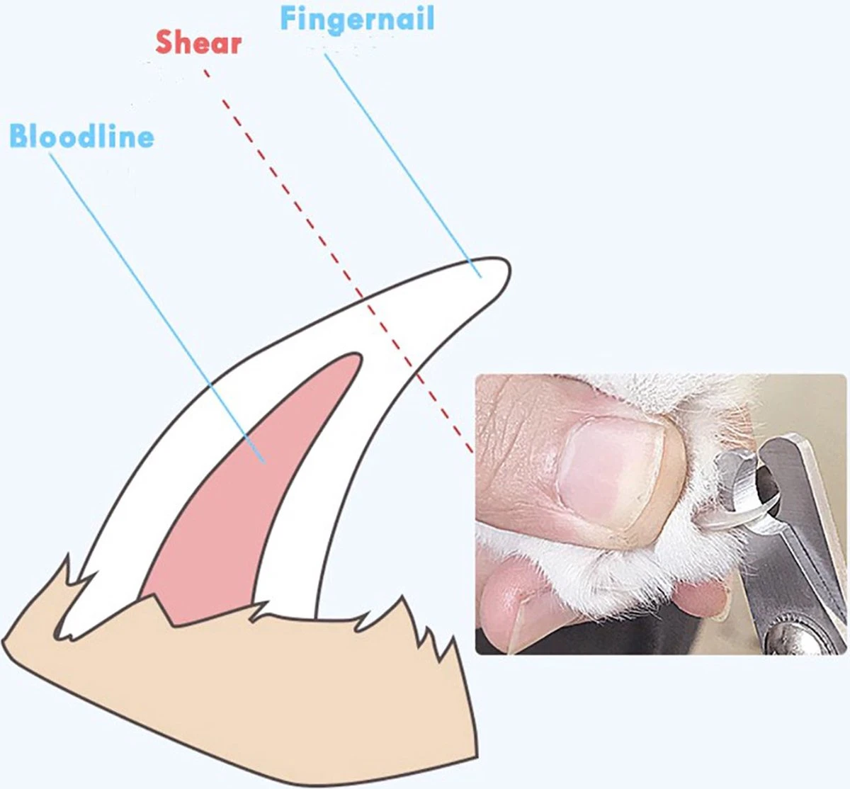 Inspecteer de nagels en stel de plaats van het bloedvat vast. Plaats de nagel tussen de snijvlakken en houdt de poot stevig vast om beweging te voorkomen. Knip snel in een soepele beweging. Het regelmatig knippen van de nagels verbeter het snel terug trekken van het bloedvat wat minder kans op bloedingen geeft.