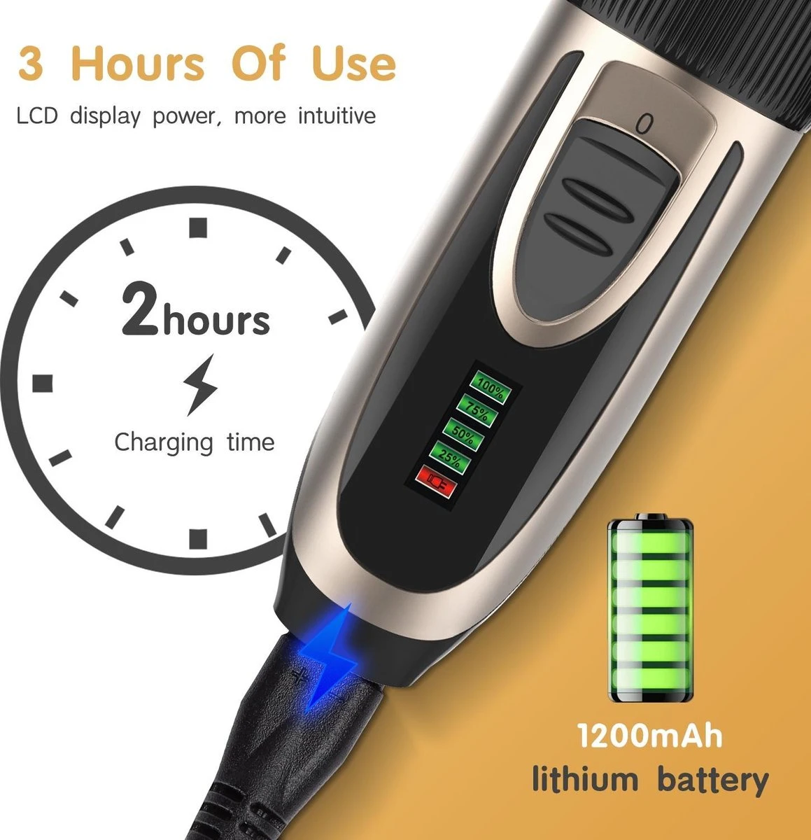 Professionele dieren trimset inclusief afstandhouders, vachtschaar en kam. Meer heb je niet nodig om de vacht van je hond of kat te trimmen. Een mooi afgewerkt draadloze uitvoering. Deze maakt weinig geluid waardoor je huisdier minder angst zal ervaren. De tondeuse is zonder opzetstuk in te stellen vanaf 0,8 t/m 2 mm. De vier opzetstukken variëren van 3 mm t/m 12 mm. Bij geheel lege accu is er slechts 2 uur nodig om de tondeuse 100% op te laden.