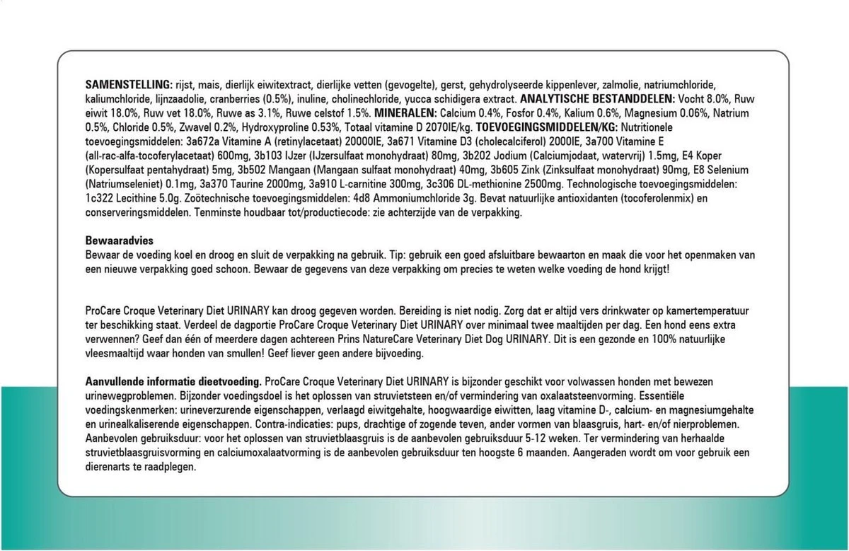 ProCare Croque Veterinary Diet Urinary is een krokante brokvoeding voor het oplossen van struvietblaasgruis bij volwassen honden en om herhaalde struviet- en calciumoxalaatblaasgruis te voorkomen. Deze voeding heeft een optimale samenstelling om struvietblaasgruis op te lossen, daarnaast bevat de voeding een aangepaste mineralenbalans om herhaling van blaasgruis te voorkomen. Cranberries dragen bij aan een gezond milieu in de blaas. Urinewegproblemen bij honden kan veroorzaakt worden door bacteriële infecties.