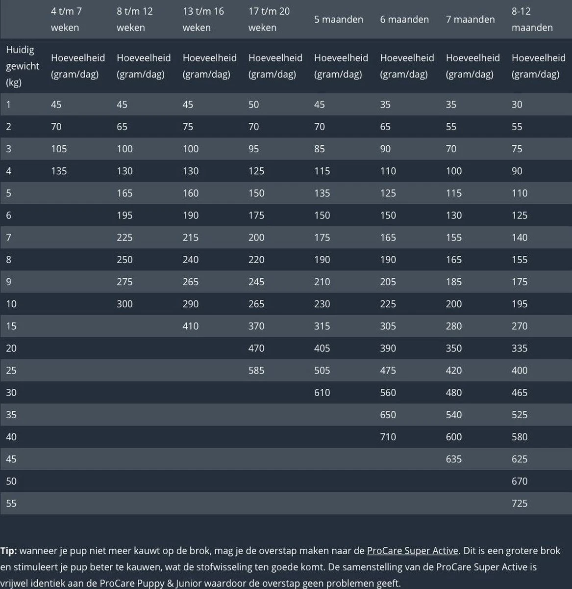 Wanneer je pup te groot wordt en niet meer kauwt op de brok, kun je de overstap maken naar de ProCare super. Deze voeding heeft een vrijwel identieke samenstelling als de ProCare puppy & junior, met als verschil een grotere brok waardoor de hond gestimuleerd wordt te kauwen. Dit bevordert de vertering en opname van voedingsstoffen.