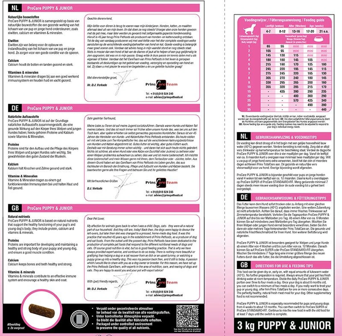 ProCare puppy & junior is een hoogwaardige voeding speciaal voor de pup en jonge hond. De met zorg geselecteerde voedingsstoffen ondersteunen een gezonde groei. Vitaminen en mineralen dragen bij aan een goed werkend immuunsysteem en een aangepast calcium en fosforgehalte zorgt voor een optimale ontwikkeling van botten en gewrichten. Je pup krijgt een gelijkmatige opbouw en zal evenwichtig opgroeien tot een volwassen hond. De toevoeging van L-carnitine zorgt voor een optimale vetverbranding.