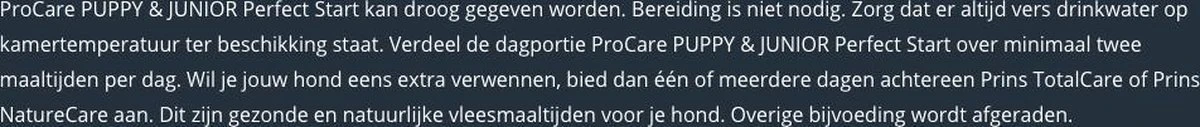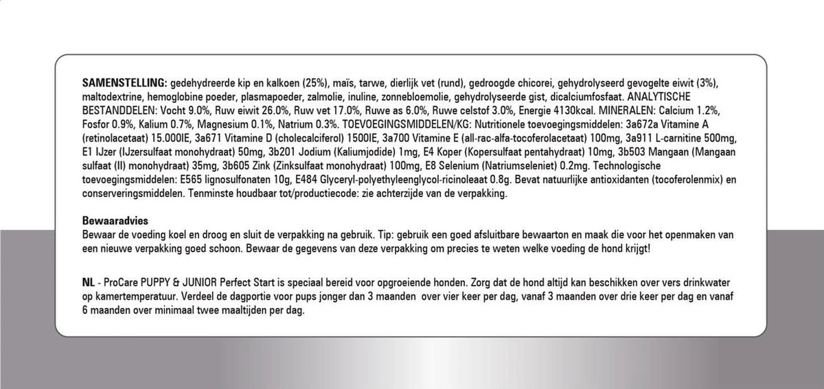 ProCare puppy & junior is bijzonder geschikt voor pups en jonge honden vanaf 4 weken tot een leeftijd van ca. 12 maanden. Daarna kun je overstappen op de ProCare super of ProCare STANDAARD-FIT. Meng gedurende minimaal 7 dagen steeds meer nieuwe voeding door de oude voeding tot u geheel bent overgestapt.