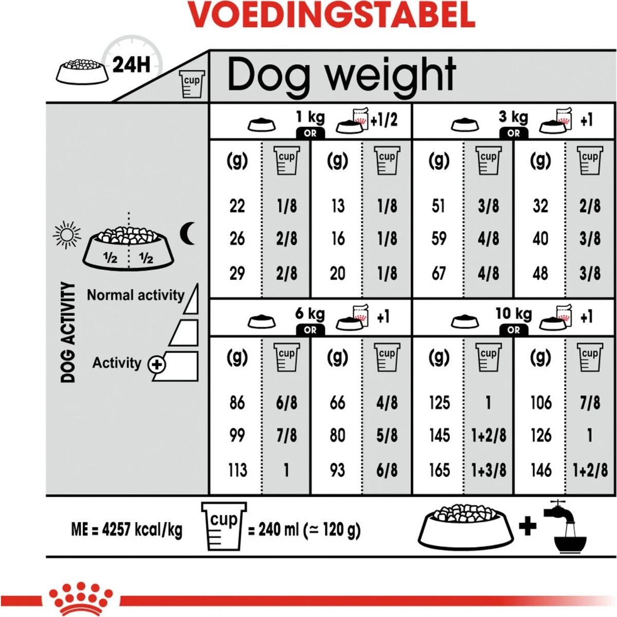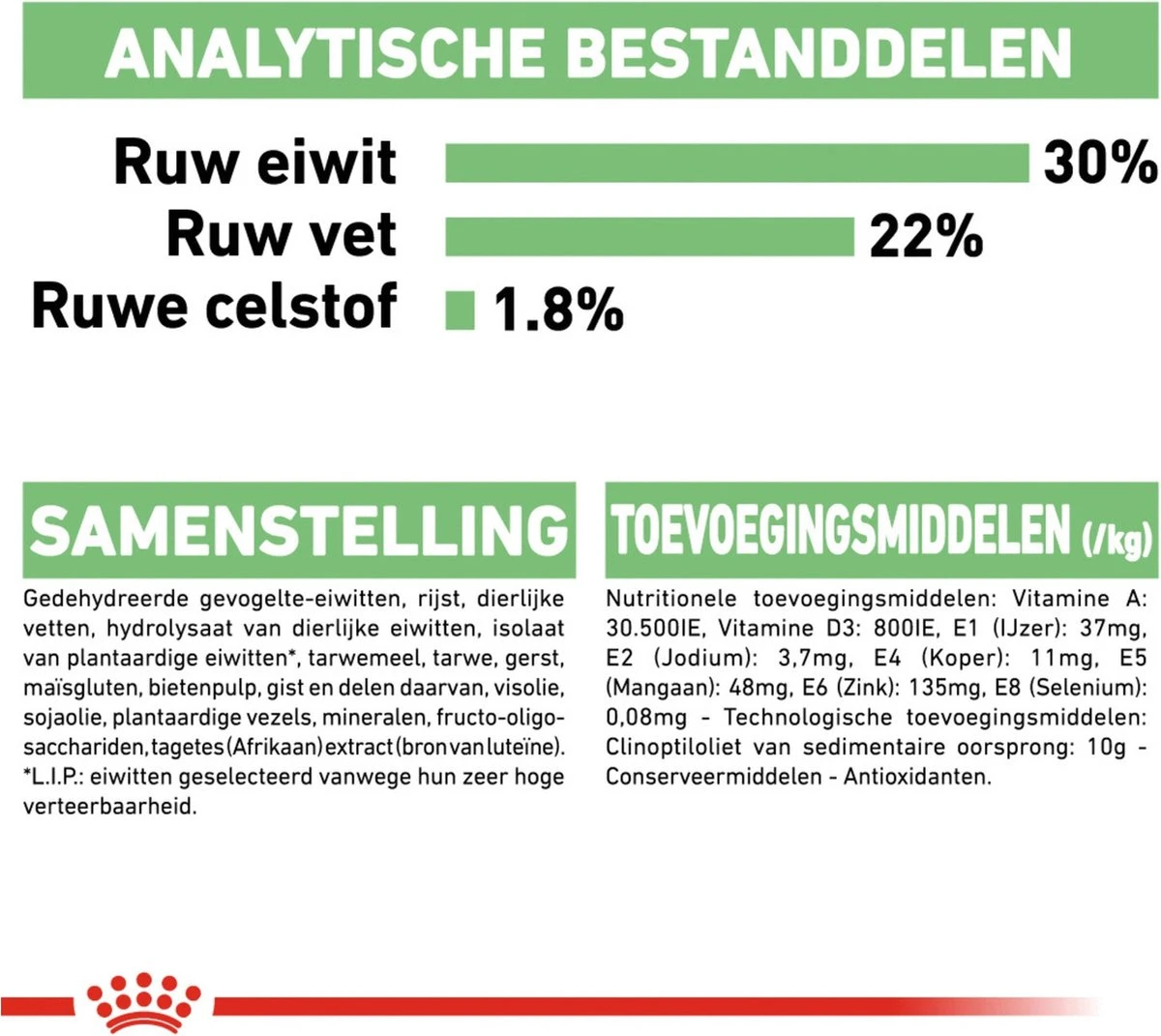 | Voedingswaarde | Volledige voeding voor honden – voor volwassen en oudere honden van kleine rassen (van 1 tot 10 kg) – vanaf 10 maanden – ter ondersteuning van de spijsvertering<br /><br />SAMENSTELLING: gedehydreerde gevogelte-eiwitten, rijst, dierlijke vetten, hydrolysaat van dierlijke eiwitten, isolaat van plantaardige eiwitten*, tarwemeel, tarwe, gerst, maïsgluten, bietenpulp, gist en delen daarvan, visolie, sojaolie, plantaardige vezels, mineralen, Fructo-Oligo-Sacchariden, Tagetes (Afrikaan) extract (bron van luteïne). TOEVOEGINGSMIDDELEN (per kg): Nutritionele toevoegingsmiddelen: Vitamine A: 30.500IE, Vitamine D3: 800IE, E1 (IJzer): 37mg, E2 (Jodium): 3,7mg, E4 (Koper): 11mg, E5 (Mangaan): 48mg, E6 (Zink): 135mg, E8 (Selenium): 0,08mg – Technologische toevoegingsmiddelen: Clinoptiloliet van sedimentaire oorsprong: 10g – Conserveermiddelen – Antioxidanten. |
